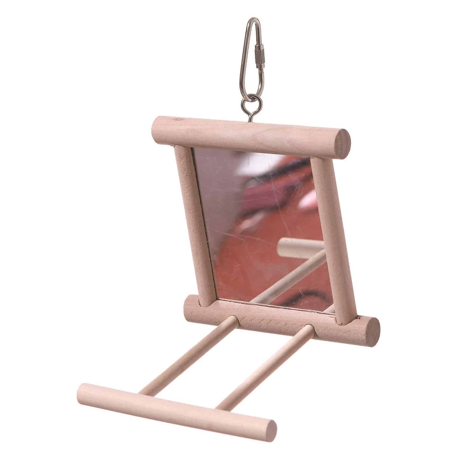 Τετράγωνος καθρέφτης με ξύλινο πλαίσιο και πατήθρα. Διαθέτει ειδικά γαντζάκια για στερέωση στο κλουβί.