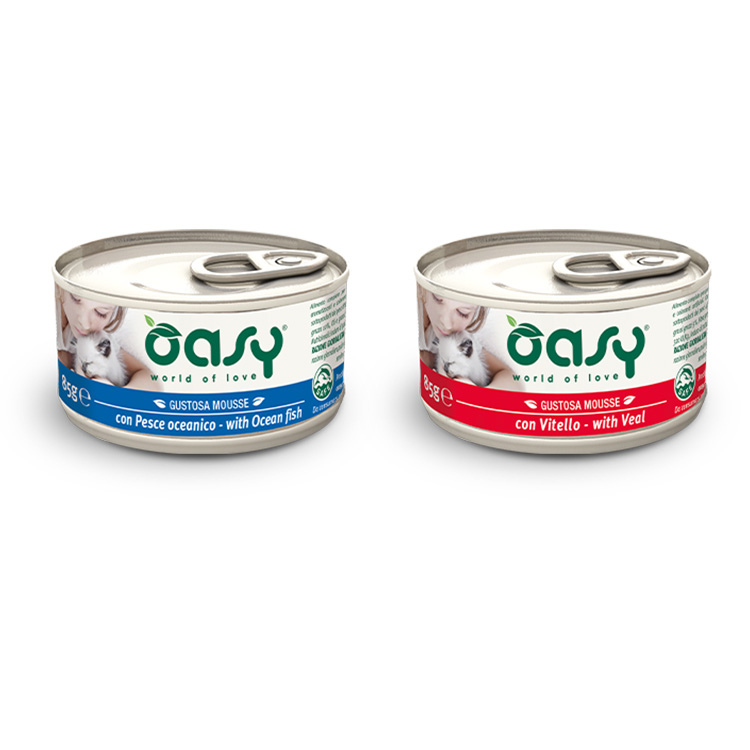 Η Oasy Mousse είναι μια σειρά υγρής τροφής πλήρης για γάτες με απαλή υφή και εξαιρετική γεύση. Η Oasy Mousse είναι ιδανική ακόμα και για τους ποιο απαιτητικούς ουρανίσκους και διατίθεται σε 11 νόστιμες γεύσεις ειδικά σχεδιασμένες να ικανοποιούν τις διατροφικές ανάγκες της γάτας. Κατασκευασμένα από υψηλής ποιότητας συστατικά, OGM και δημητριακά χωρίς πειράματα σε ζώα.