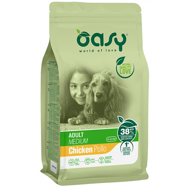 Oasy Dry Dog Adult Medium Chicken .Πλήρης τροφή για κατοικίδια για ενήλικους σκύλους μεσαίων φυλών ηλικίας ενός έτους και άνω. ΚΑΤΆΛΛΗΛΟ ΓΙΑ Ενήλικα σκυλιά, μεσαίας φυλής.