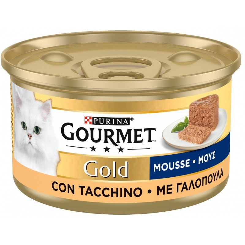 Πλήρης υγρή τροφή , κονσέρβα Purina Gourmet Gold Mousse Με Γαλοπούλα 85gr για ενήλικες γάτες. H γάτα σας είναι ένας αληθινός γευσιγνώστης και λατρεύει να δοκιμάζει κάθε μέρα διαφορετικές υφές και γεύσεις. Γι αυτό το λόγο η GOURMET Gold δημιούργησε την σειρά ΠΑΤΕ,νόστιμες συνταγές που θα την κακομάθουν με μια διαφορετική γευστική εμπειρία σε κάθε γεύμα.