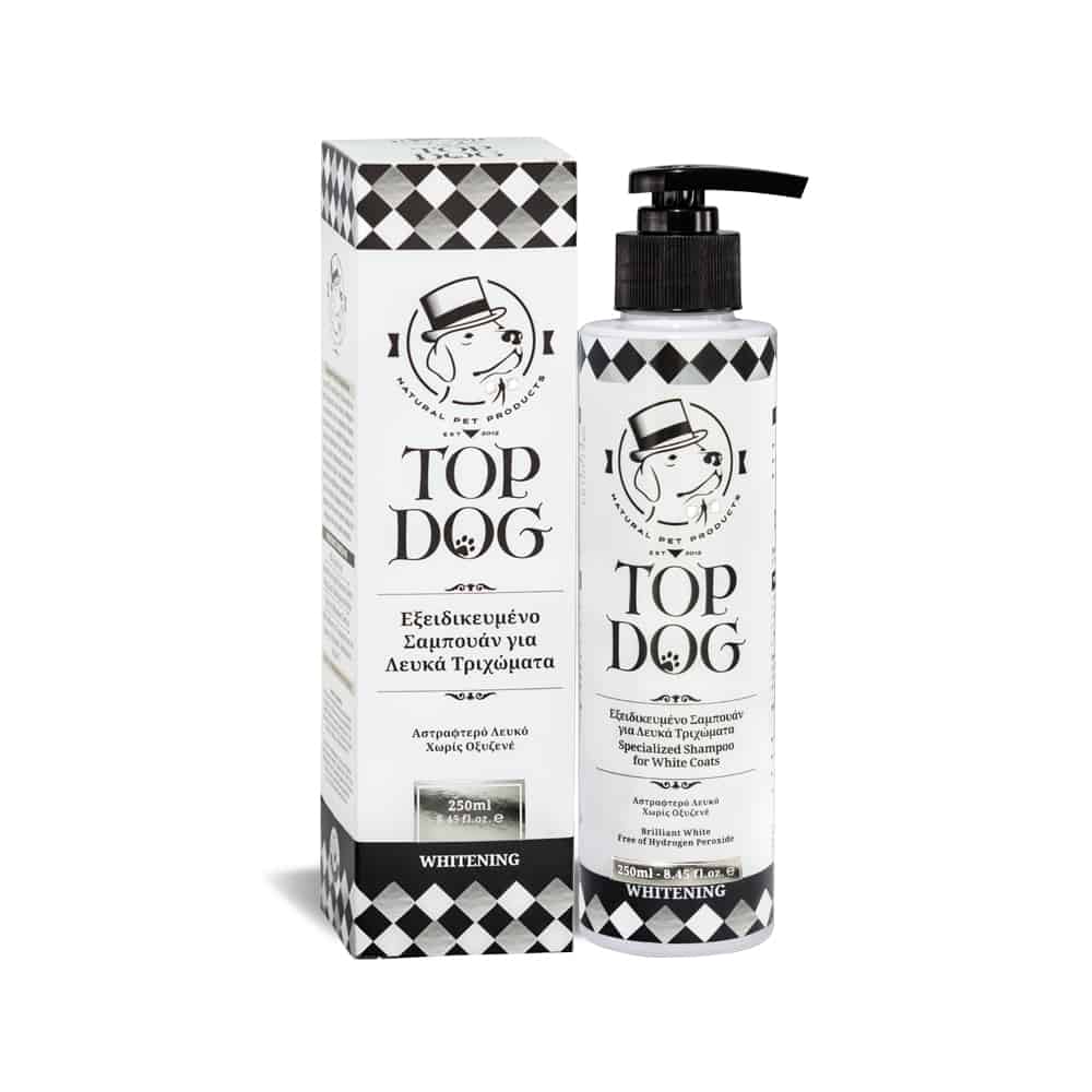 Το Σαμπουάν Whitening είναι ένα εξειδικευμένο προϊόν ειδικά σχεδιασμένο για χρήση σε κατοικίδια με λευκό τρίχωμα. Η ιδιαιτερότητά του είναι η χρήση της Λουλακί Βαφής η οποία απομακρύνει αποτελεσματικά τους ανεπιθύμητους χρωματισμούς από το λευκό μανδύα για μέρες. Χαρίζει αστραφτερό λευκό χωρίς να περιέχει οξυζενέ και ισχυρές λευκαντικές ουσίες.